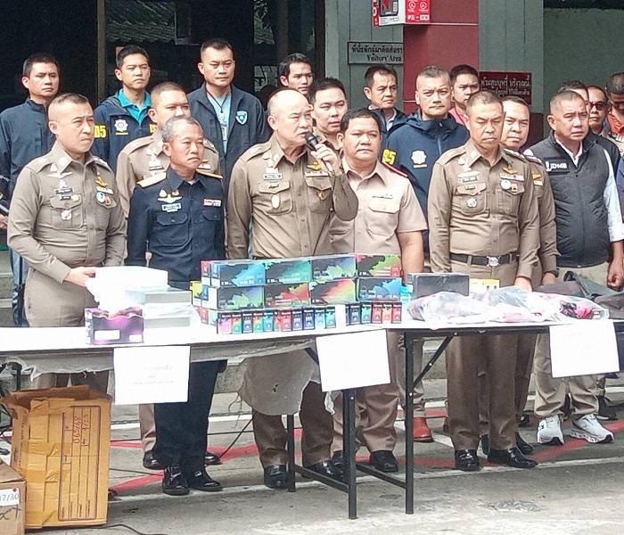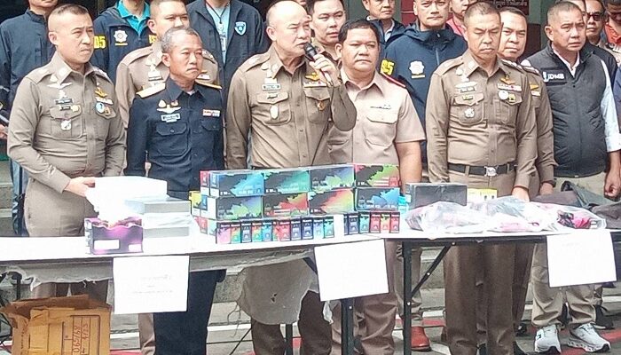 วันนี้ (3 มิ.ย.68) เวลา 10.00 น. ที่สน.ท่าเรือ เขตคลองเตย กรุงเทพฯ พล.ต.อ.ประจวบ วงศ์สุข รอง ผบ.ตร. พร้อมด้วย พล.ต.ท.สำราญ นวลมา ผู้ช่วย ผบ.ตร., พล.ต.ท.สยาม บุญสม ผบช.น., พล.ต.ต.นพศิลป์ พูลสวัสดิ์ รอง ผบช.น., พล.ต.ต.โชติวัฒน์ เหลืองวิลัย ผบก.สส.บช.น., พล.ต.ต.วิทวัฒน์ ชินคำ ผบก.น.5 พร้อมเจ้าหน้าที่กรมศุลกากร และเจ้าหน้าที่การท่าเรือฯ ร่วมแถลงความคืบหน้ากรณี 5 ผู้ต้องที่ร่วมกันปล้นตู้คอนเทรนเนอร์บรรจุบุหรี่ไฟฟ้าของกลาง ของกรมศุลกากร บริเวณหน้าโกดัง สเตเดียม แขวงคลองเตย เขตคลองเตย กรุงเทพฯ
