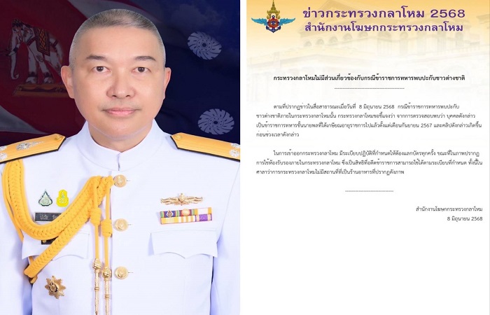 ล่าสุด วันนี้ (9 มิ.ย.68) พลเรือตรี ปารัช รัตนไชยพันธ์ รองโฆษกกองทัพเรือ เปิดเผยว่า จากกรณีสำนักงานโฆษกกระทรวงกลาโหม ออกแถลงการณ์เรื่องกระทรวงกลาโหมไม่มีส่วนเกี่ยวข้องกับกรณีข้าราชการทหารพบปะกับชาวต่างชาติ โดยระบุว่า ตามที่ปรากฏข่าวในสื่อสาธารณะ เมื่อวันที่ 8 มิถุนายน 2568 กรณีข้าราชการทหารพบปะกับชาวต่างชาติภายในกระทรวงกลาโหม ซี่งทาง กระทรวงกลาโหม ได้ชี้แจงว่า จากการตรวจสอบพบว่า บุคคลดังกล่าวเป็นข้าราชการทหารชั้นนายพลที่ได้เกษียณอายุราชการไปแล้วตั้งแต่เดือนกันยายน 2567 และคลิปดังกล่าวเกิดขึ้นก่อนช่วงเวลาดังกล่าว ในการเข้าออกกระทรวงกลาโหม มีระเบียบปฏิบัติที่กำหนดให้ต้องแลกบัตรทุกครั้ง