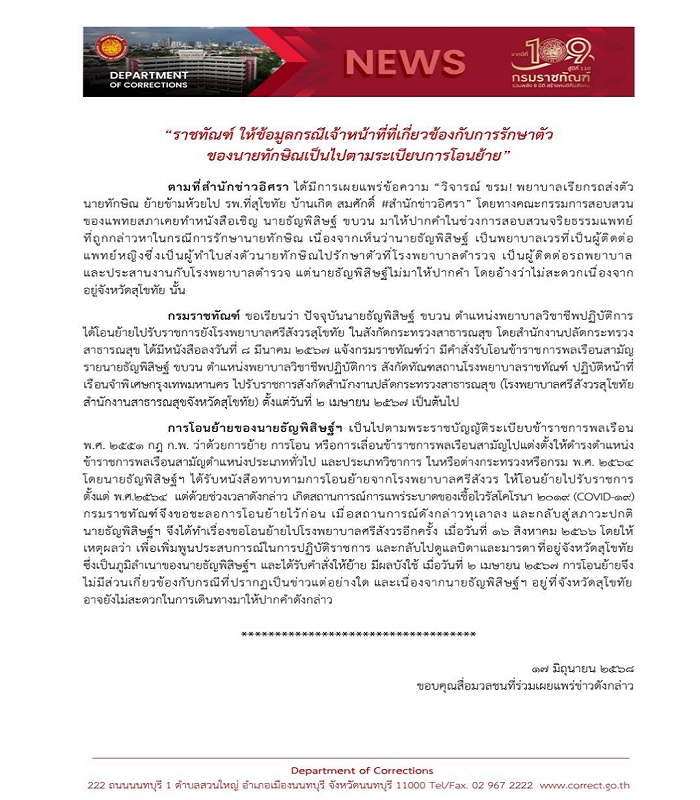 “ราชทัณฑ์” ให้ข้อมูลกรณีเจ้าหน้าที่ที่เกี่ยวข้องกับการรักษาตัวของนายทักษิณ เป็นไปตามระเบียบการโอนย้าย