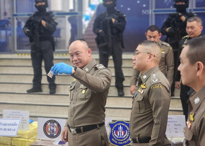 วันนี้ (8 ก.ค.68) ที่กองบัญชาการตำรวจปราบปรามยาเสพติด (บช.ปส.) พล.ต.อ.ประจวบ วงศ์สุข รอง ผบ.ตร./ประธานอนุกรรมการป้องกันปราบปรามการพักคอยยาเสพติดในพื้นที่ตอนในและสกัดกั้นการลำเลียง ยาเสพติดลงสู่พื้นที่ภาคใต้ พร้อมด้วย พล.ต.ท.สันติ ชัยนิรามัย ผบช.ปส., พล.ต.ต.สมบูรณ์ เทียนขาว, พล.ต.ต.ออมสิน ตรารุ่งเรือง, พล.ต.ต.พรศักดิ์ สุรสิทธิ์, พล.ต.ต.ธนรัชน์ สอนกล้า รอง ผบช.ปส., ผบก.ปส.1 – 4, ผบก.สกส. และ ผบก.ขส. ร่วมแถลงการจับกุมเครือข่ายยาเสพติดรายใหญ่ 9 คดี ผู้ต้องหา 22 คน พร้อมของกลางยาบ้า 31,800,000 เม็ด ไอซ์ 1,105 กิโลกรัม และ เฮโรอีน 173 กิโลกรัม รถยนต์ของกลาง 14 คัน
