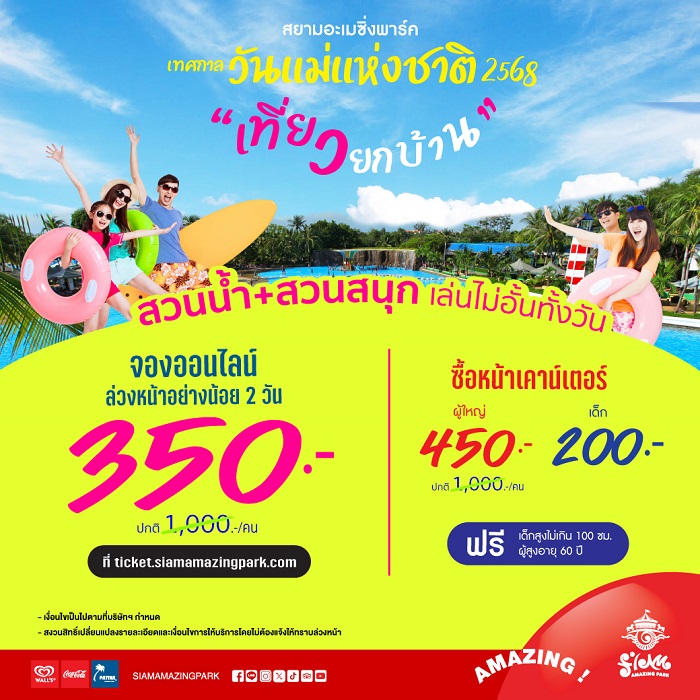 ดีลคุ้มที่สุด! บัตรผู้ใหญ่ซื้อล่วงหน้าอย่างน้อย 2 วัน ลดเหลือ 350.-* (ปกติ 1,000.-) ที่ ticket.siamamazingpark.com หรือโปรปังๆ หน้าเคาน์เตอร์ รวมผ่านประตู+สวนน้ำ+สวนสนุก เข้าใช้บริการได้เลย บัตรผู้ใหญ่ ลดเหลือ 450.- (ปกติ 1,000.-) บัตรเด็ก เพียง 200.- (สูง 101-130 ซม.) ฟรี! เด็กสูงไม่เกิน 100 ซม. + ผู้สูงอายุ 60ปี ขึ้นไป + ผู้พิการ