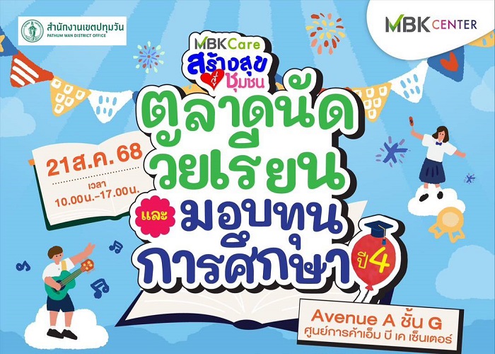 ศูนย์การค้าเอ็ม บี เค เซ็นเตอร์ เปิดพื้นที่แห่งการเรียนรู้เชิงประสบการณ์ให้น้อง ๆ นักเรียน จาก 7 โรงเรียนในเขตปทุมวัน สังกัดกรุงเทพมหานคร สวมบทบาทพ่อค้าแม่ค้ารุ่นเยาว์ นำผลงานฝีมือมาออกบูธขายของในงาน ตลาดนัดวัยเรียน ภายใต้โครงการ MBK Care สร้างสุขสู่ชุมชน โดยปีนี้จัดขึ้นเป็นปีที่ 4 ภายใต้แนวคิด “เติมฝัน ปั้นอนาคต จุดประกายการเรียนรู้ สู่วัยเรียนที่สดใส” พร้อมกิจกรรม มอบทุนการศึกษา ให้กับนักเรียน ในโรงเรียนสังกัดกรุงเทพมหานคร ในวันพฤหัสบดีที่ 21 สิงหาคมนี้ ตั้งแต่ 10.00 น. – 17.00 น. บริเวณลานอเวนิว โซน A