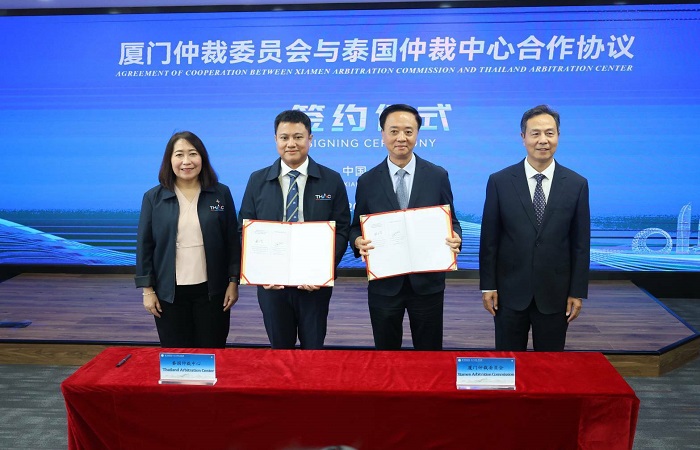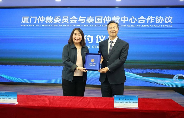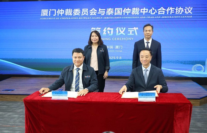 ต่อมาวันที่ 8 ก.ย.68 สถาบันอนุญาโตตุลาการ (THAC) ได้ลงนามบันทึกความร่วมมือ (MOU) กับ Xiamen Arbitration Commission ณ เมืองเซี่ยเหมิน สาธารณรัฐประชาชนจีน เพื่อส่งเสริมความร่วมมือด้านการระงับข้อพิพาททางการค้าระหว่างประเทศ โดยพิธีลงนามในครั้งนี้ได้รับเกียรติจาก นางพงษ์สวาท นีละโยธิน ปลัดกระทรวงยุติธรรม ในฐานะประธานคณะกรรมการสถาบันอนุญาโตตุลาการ เป็นประธานและสักขีพยานการลงนาม พร้อมด้วยผู้บริหารและคณะกรรมการจากสถาบันฯ เข้าร่วมในพิธีลงนาม ได้แก่ นายสุริยพงศ์ ทับทิมแท้ ผู้อำนวยการสถาบันอนุญาโตตุลาการ นายวัลลภ นาคบัว รองปลัดกระทรวงยุติธรรม ในฐานะคณะกรรมการสถาบันอนุญาโตตุลาการ และ นายไกรรวี ศิริกุล คณะกรรมการสถาบันอนุญาโตตุลาการ เข้าร่วม โดยความร่วมมือครั้งนี้มีเป้าหมายหลักในการแลกเปลี่ยนองค์ความรู้ ประสบการณ์ และบุคลากรด้านการอนุญาโตตุลาการ รวมถึงการประนอมข้อพิพาท เพื่อยกระดับมาตรฐานการให้บริการทางกฎหมายของทั้งสองสถาบันให้มีประสิทธิภาพและเป็นที่ยอมรับในระดับสากลมากขึ้น