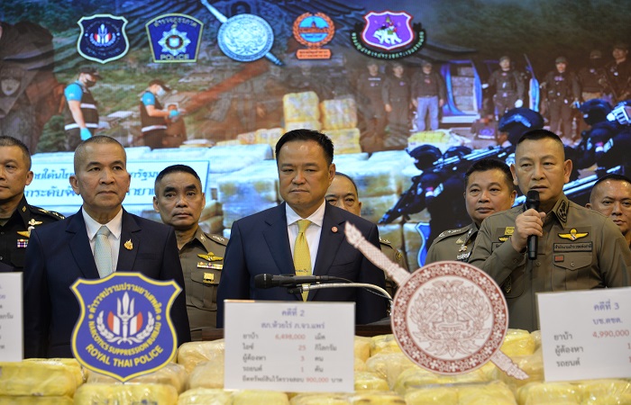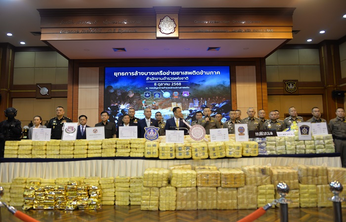 วันนี้ (8 ต.ค.68) เวลา 11.00 น. ที่กองบัญชาการตำรวจปราบปรามยาเสพติด (บช.ปส.) นายอนุทิน ชาญวีรกูล นายกรัฐมนตรีและรมว.มหาดไทยพร้อมด้วย พล.ต.ท.รุทธพล เนาวรัตน์ รมว.ยุติธรรม, พล.ต.อ.กิตติ์รัฐ พันธุ์เพ็ชร์ ผบ.ตร., พ.ต.ต.สุริยา สิงหกมล เลขาธิการ ป.ป.ส., พล.ต.อ.สำราญ นวลมา รอง ผบ.ตร., พล.ต.ท.สมประสงค์ เย็นท้วม ผู้ช่วย ผบ.ตร., พล.ต.ท.อาชยน ไกรทอง ผบช.ปส., พล.ต.ท.รุ่งโรจน์ ฐากูรปุณยสิริ ผบช.ตชด., พล.ต.ท.กฤตธาพล ยี่สาคร ผบช.ภ.5, พล.ต.ท.สยาม บุญสม ผบช.น., พล.ต.สราวุธ ประเสริฐชีวะ รอง ผอ.ศปป.2 กอ.รมน. และเจ้าหน้าที่ที่เกี่ยวข้อง ร่วมแถลงผลปฏิบัติ “ยุทธการล้างบางเครือข่ายยาเสพติดข้ามภาค” โดยจับกุมได้ 4 คดี ผู้ต้องหา 10 ราย พร้อมของกลางยาบ้า 15.78 ล้านเม็ด, ไอซ์ 235 กก. และยึดทรัพย์สินจำนวนมาก