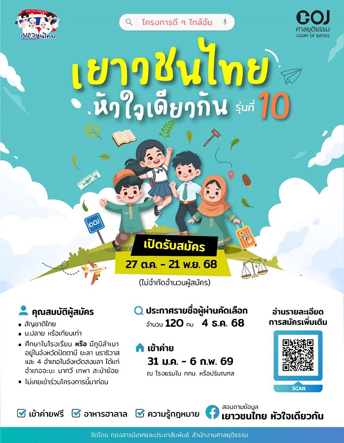 สำนักงานศาลยุติธรรม โดยกองสารนิเทศและประชาสัมพันธ์ ขอเชิญชวนน้อง ๆ อายุระหว่าง 15-18 ปี ที่กำลังศึกษาอยู่ในระดับมัธยมศึกษาตอนปลายหรือเทียบเท่า ในสถาบันการศึกษา ซึ่งมีที่ตั้งในจังหวัดชายแดนใต้ ได้แก่ จังหวัดปัตตานี ยะลา นราธิวาส และ 4 อำเภอของจังหวัดสงขลา ได้แก่ อำเภอจะนะ อำเภอนาทวี อำเภอเทพา และ อำเภอสะบ้าย้อย หรือมีภูมิลำเนาในพื้นที่ดังกล่าว สมัครเข้าร่วมโครงการเยาวชนไทย หัวใจเดียวกัน รุ่นที่ 10 โดยสามารถดูรายละเอียดได้ที่เว็บไซต์ กองสารนิเทศและประชาสัมพันธ์ สำนักงานศาลยุติธรรม https://iprd.coj.go.th และ เฟซบุ๊กเยาวชนไทย หัวใจเดียวกัน https://www.facebook.com/BeliaThaiSejiwaSehati
