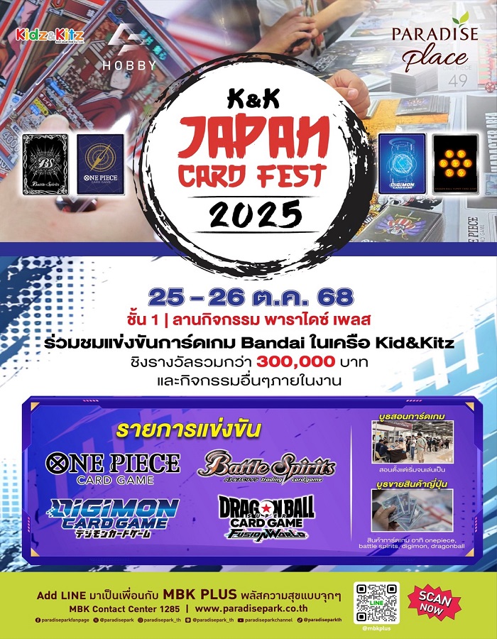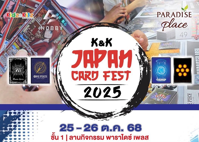 พาราไดซ์ เพลส ศูนย์การค้าในเครือเอ็ม บี เค ร่วมกับ Kidz & Kitz และ DP Hobby ชวนเหล่าเกมเมอร์และแฟนพันธุ์แท้การ์ดเกมญี่ปุ่น ร่วมสนุกกับงาน K&K JAPAN CARD FEST 2025 การแข่งขันการ์ดเกมที่รวบรวมเกมดังระดับตำนานจากค่าย Bandai มาไว้ในที่เดียว! ให้นักแข่งได้ดวลฝีมือกันอย่างเต็มที่ ชิงเงินรางวัลรวมกว่า 300,000 บาท