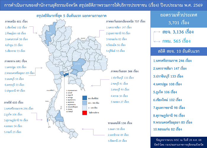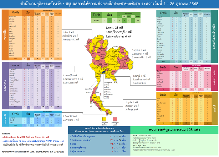 วันนี้ (1 พ.ย.68) พล.ต.ท.รุทธพล เนาวรัตน์ รัฐมนตรีว่าการกระทรวงยุติธรรม (รมว.ยธ.) เปิดเผยว่า ตั้งแต่วันที่ 1-26 ตุลาคม 2568 พบสถิติการให้บริการประชาชนของสำนักงานยุติธรรมจังหวัดทั่วประเทศ 81 แห่ง และ กทม. มียอดรวมกว่า 3,701 เรื่อง โดยจังหวัดที่มียอดการให้บริการประชาชน 10 อันดับแรก ได้แก่ 1.นครศรีธรรมราช 246 เรื่อง 2.นครนครราชสีมา 147 เรื่อง 3.ปราจีนบุรี 133 เรื่อง 4.นครปฐม 108 เรื่อง 5.ภูเก็ต 106 เรื่อง 6.เชียงใหม่ 102 เรื่อง 7.อุบลราชธานี 98 เรื่อง 8.สุราษฎร์ธานี 96 เรื่อง 9.พระนครศรีอยุธยา 85 เรื่อง และ 10.ขอนแก่น 82 เรื่อง