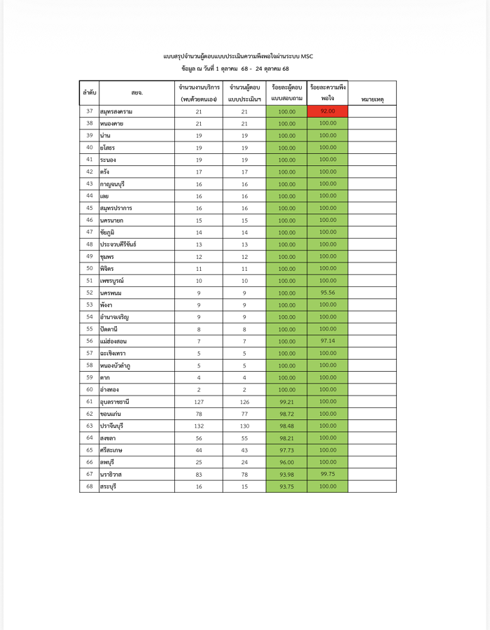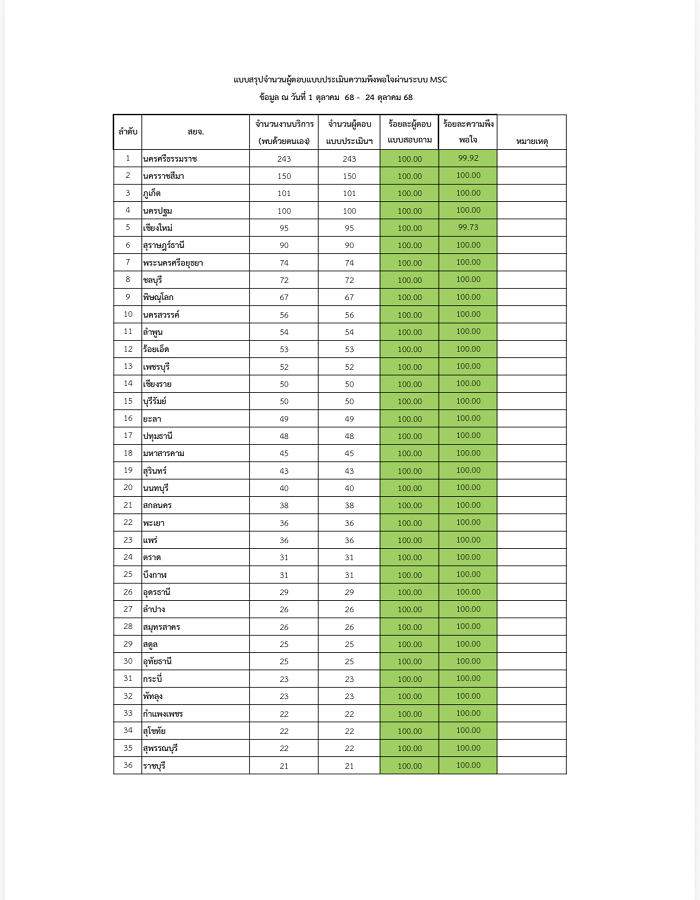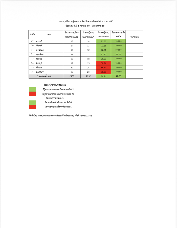 นอกจากนี้ จากแบบสรุปจำนวนผู้ต่อแบบประเมินความพึงพอใจผ่านระบบ MSC ข้อมูล ณ วันที่ 1-24 ตุลาคม 2568 พบประชาชนมีความพึงพอใจโดยรวมทั่วประเทศอยู่ที่ ร้อยละ 99.78 ซึ่งสะท้อนประสิทธิภาพการดำเนินงานของสำนักงานยุติธรรมจังหวัด ตามนโยบายกระทรวงยุติธรรมและนโยบายรัฐบาล