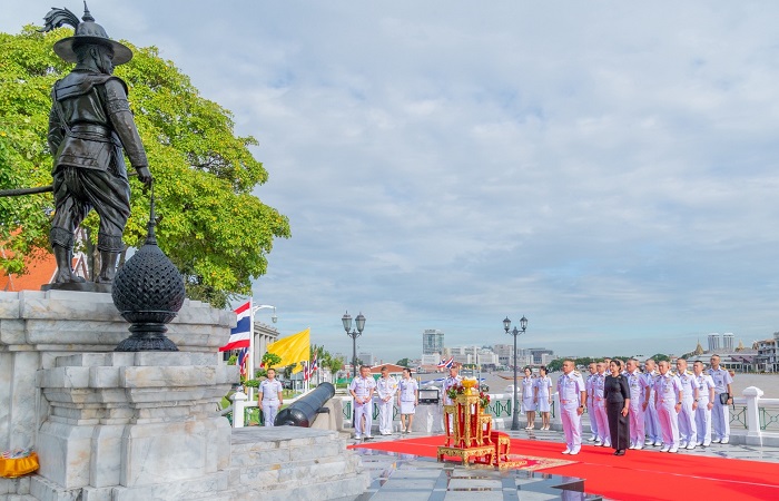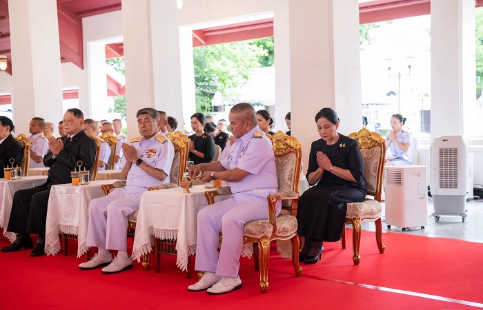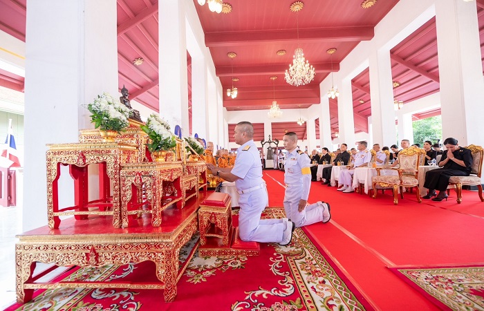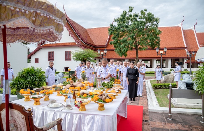 ทั้งนี้ ในช่วงเช้า เมื่อเวลา 06.30 น. ผู้บัญชาการทหารเรือ นายกสมาคมภริยาทหารเรือ พร้อมด้วย ผู้บังคับบัญชาระดับสูงของกองทัพเรือและคู่สมรส ได้นำหัวหน้าหน่วยขึ้นตรงกองทัพเรือ ในพื้นที่กรุงเทพมหานครและปริมณฑล ทำบุญตักบาตร ณ บริเวณลานหน้าอาคารกองบัญชาการกองทัพเรือพระราชวังเดิม โดยได้นิมนต์พระภิกษุสงฆ์ จำนวน 49 รูป จากวัดโมลีโลกยารามราชวรวิหาร และ วัดชิโนรสารามวรวิหาร