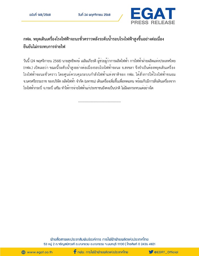 วันนี้ (24 พ.ย.68) นายสุทธิพงษ์ เฉลิมเกียรติ ผู้ช่วยผู้ว่าการผลิตไฟฟ้า การไฟฟ้าฝ่ายผลิตแห่งประเทศไทย (กฟผ.) เปิดเผยว่า ขณะนี้ระดับน้ำสูงอย่างต่อเนื่องรอบโรงไฟฟ้าจะนะ จ.สงขลา จึงจำเป็นต้องหยุดเดินเครื่องโรงไฟฟ้าจะนะชั่วคราว โดยศูนย์ควบคุมระบบกำลังไฟฟ้าแห่งชาติของ กฟผ. ได้สั่งการให้โรงไฟฟ้าขนอม จ.นครศรีธรรมราช ของบริษัท ผลิตไฟฟ้า จำกัด (มหาชน) เดินเครื่องเพิ่มขึ้นเพื่อทดแทน พร้อมกับมีการสั่งเดินเครื่องจากโรงไฟฟ้ากระบี่ จ.กระบี่ เสริม ทำให้การจ่ายไฟฟ้าแก่ประชาชนยังคงเป็นปกติ ไม่มีผลกระทบแต่อย่างใด