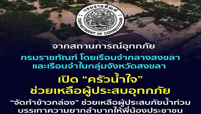 กรมราชทัณฑ์ โดย เรือนจำกลางสงขลา และเรือนจำในกลุ่มจังหวัดสงขลา ร่วมระดมความช่วยเหลือประชาชนที่ได้รับผลกระทบจากสถานการณ์อุทกภัยในหลายพื้นที่ของจังหวัดสงขลา เปิด “ครัวน้ำใจ” เพื่อจัดทำอาหารปรุงสุกที่สะอาด ถูกสุขลักษณะ และได้มาตรฐาน ภายใต้การดูแลของเจ้าหน้าที่และผู้ต้องขังที่ผ่านการฝึกอบรมด้านโภชนาการ เพื่อจัดส่ง “ข้าวกล่องช่วยเหลือผู้ประสบภัยน้ำท่วม” มอบให้ประชาชนในพื้นที่ที่ได้รับผลกระทบโดยตรง ซึ่งขณะนี้มีประชาชนจำนวนมากประสบความเดือดร้อนและต้องการการสนับสนุนอย่างเร่งด่วนการดำเนินงานครั้งนี้มีเป้าหมายเพื่อบรรเทาความยากลำบากของพี่น้องประชาชน ลดภาระในภาวะวิกฤต และเป็นกำลังใจให้ผู้ประสบภัยสามารถก้าวผ่านสถานการณ์ยากลำบากไปได้ โดยกรมราชทัณฑ์ยังคงเดินหน้าประสานความร่วมมือกับหน่วยงานท้องถิ่นและภาคีเครือข่ายเพื่อให้การช่วยเหลือเป็นไปอย่างรวดเร็วและทั่วถึง