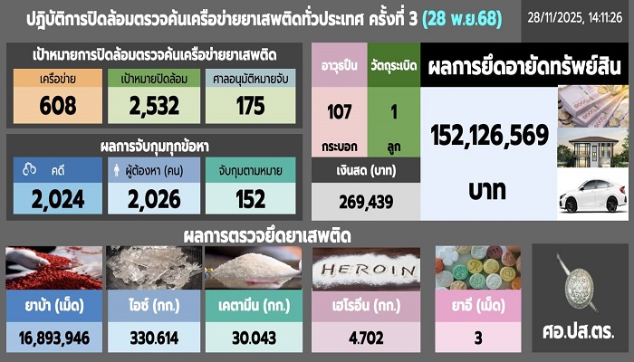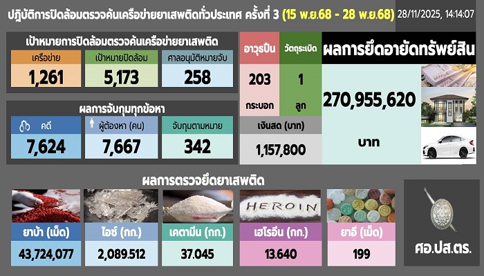 ทั้งนี้ ระหว่างวันที่ 15 – 28 พ.ย.68 ได้ปิดล้อมตรวจค้นเป้าหมายยาเสพติดรวมทั้งสิ้น 5,173 จุด 1,261 เครือข่ายยาเสพติด จับกุมผู้ต้องหา 7,667 ราย ตรวจยึดยาเสพติด แบ่งเป็น ยาบ้า 43,724,077 เม็ด, ไอซ์ 2,089.512 กิโลกรัม, เคตามีน 37.045 กิโลกรัม, เฮโรอีน 13.640 กิโลกรัม, ยาอี 199 เม็ด พร้อมทั้งตรวจยึดอาวุธปืน 203 กระบอก, วัตถุระเบิด 1 ลูก, เงินสด 1,157,800 บาท ผลการอายัดทรัพย์สินรวม 270,955,620 บาท