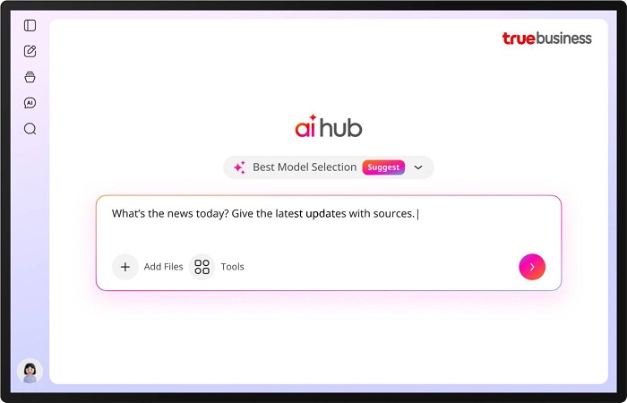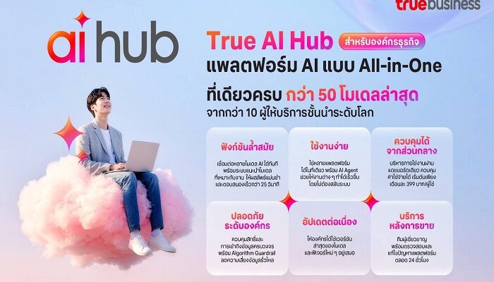 ทรูบิสิเนส ดึงศักยภาพผู้นำบริการสื่อสารและดิจิทัลโซลูชันครบวงจรสำหรับลูกค้าธุรกิจ ย้ำวิสัยทัศน์การเป็นพันธมิตรในเส้นทาง Digital&AI Transformation ขององค์กรไทย เปิดตัว “True AI Hub” แพลตฟอร์ม AI แบบ All-in-one ที่ออกแบบมาเพื่อรองรับการใช้งาน AI ทุกรูปแบบสำหรับธุรกิจทุกขนาด ทลายทุกข้อจำกัดในการใช้ AI ครบเครื่องทั้งประสิทธิภาพและความแม่นยำ ยืดหยุ่น ครอบคลุมทุกความต้องการใช้งานด้วยแพลตฟอร์ม AI มากกว่า 50 โมเดล จากกว่า 10 ผู้ให้บริการแพลตฟอร์ม AI ชั้นนำระดับโลก ใช้งานง่ายผ่านเว็บ พร้อมระบบแนะนำการเลือกใช้โมเดลและฟีเจอร์ตามโจทย์ธุรกิจ เลือกใช้ได้หลายแพลตฟอร์มในที่เดียว มั่นใจด้วยมาตรฐานความปลอดภัยระดับองค์กร ด้วย Algorithm Guardrail ปกป้องข้อมูลสำคัญของธุรกิจ มาพร้อมระบบบริหารจัดการจากศูนย์กลางผ่านแดชบอร์ด ควบคุมได้ทั้งค่าใช้จ่าย การใช้งาน และความปลอดภัย คุ้มค่าด้วยแพ็กเกจบริการแบบรายเดือนไม่ต้องลงทุนขนาดใหญ่ เริ่มต้นเพียงเดือนละ 399 บาทต่อผู้ใช้ รองรับทุกประเภทธุรกิจที่ต้องการยกระดับขีดความสามารถ เร่งผลลัพธ์โดยไม่ต้องลงทุนสูง เพื่อช่วงชิงความได้เปรียบในการแข่งขัน ท่ามกลางความท้าทายของโลกธุรกิจในยุค AI-first