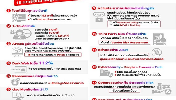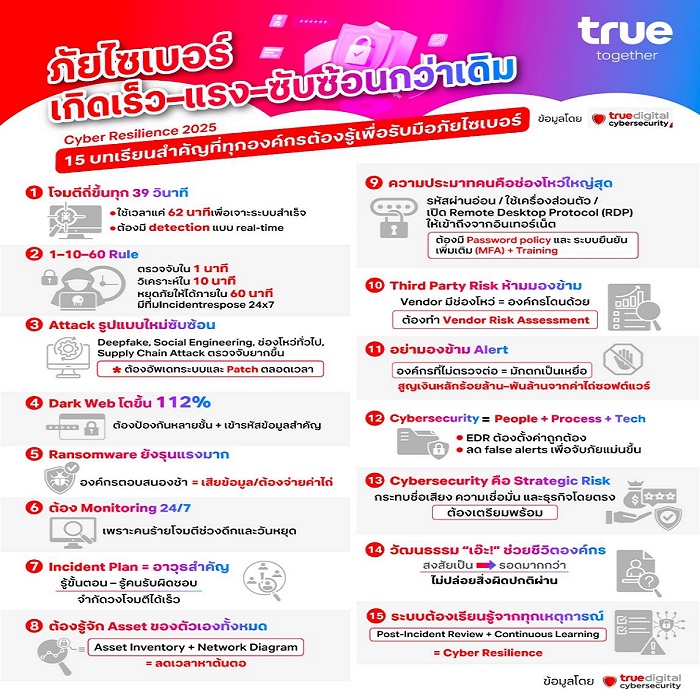 การโจมตีทางไซเบอร์ในปัจจุบันนี้ไม่ใช่เรื่องไกลตัวอีกต่อไป แต่กลายเป็นความเสี่ยงที่เกิดขึ้นได้กับทุกองค์กร ไม่ว่าจะใหญ่หรือเล็ก องค์กรจึงไม่ควรหยุดอยู่แค่การ “ป้องกันไม่ให้ถูกโจมตี” เท่านั้น แต่ต้องเร่งปรับตัวทั้งมุมมอง กระบวนการ และเครื่องมือ เพื่อเตรียมพร้อมรับมือเมื่อเหตุการณ์ไม่คาดคิดเกิดขึ้นจริง แล้วองค์กรจะเริ่มตรงไหนดี และสามารถเรียนรู้อะไรได้บ้างจากเหตุการณ์ที่เคยเกิดขึ้นแล้ว ทรู ดิจิทัล กรุ๊ป โดย คุณฐิติรัตน์ ศิริพัฒนาเลิศ หัวหน้าสายงานด้านไซเบอร์ ซิเคียวริตี้ ได้แบ่งปันมุมมองที่เป็นประสบการณ์จากเหตุการณ์ภัยไซเบอร์ที่เกิดขึ้นจริง พร้อมสรุปเป็นบทเรียนและแนวทางเสริมสร้าง “ภูมิต้านทานทางไซเบอร์ (Cyber Resilience)” ที่ทุกองค์กรควรนำไปปรับใช้ในการรับมือกับภัยคุกคามในปัจจุบันได้อย่างเป็นรูปธรรม