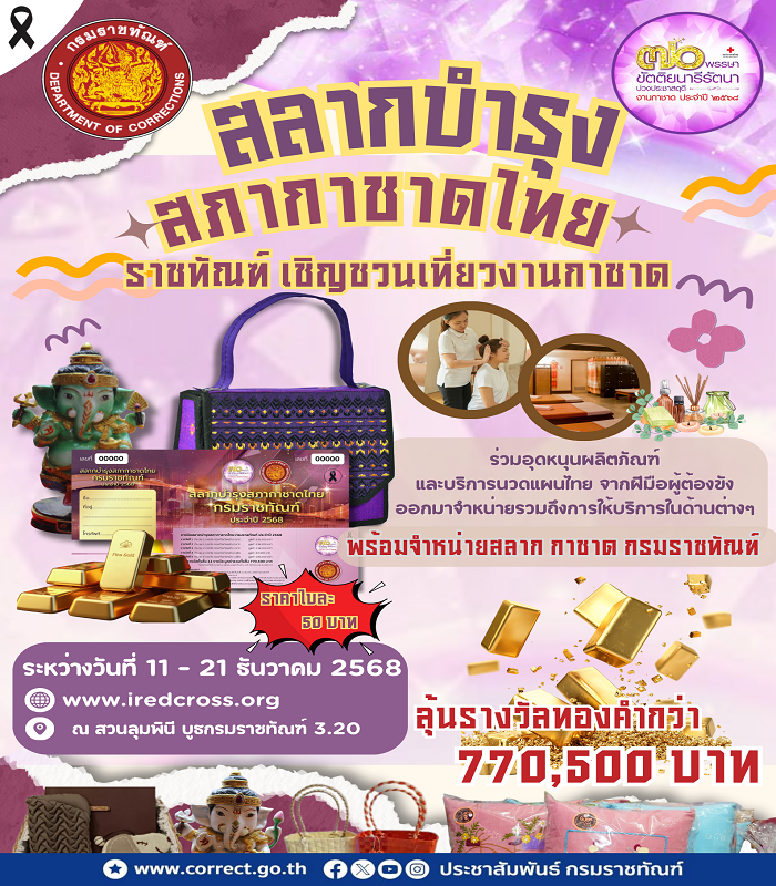 กรมราชทัณฑ์ เชิญชวนเที่ยวงานกาชาดประจำปี 2568 ร่วมอุดหนุนผลิตภัณฑ์ผู้ต้องขัง ภายใต้แนวคิด “ร้อยดวงใจ ปวงประชา น้อมสำนึกพระเมตตา องค์สภานายิกาสภากาชาดไทย” ระหว่างวันที่ 11 – 21 ธันวาคม 2568 ณ สวนลุมพินี เขตุปทุมวัน กรุงเทพมหานคร