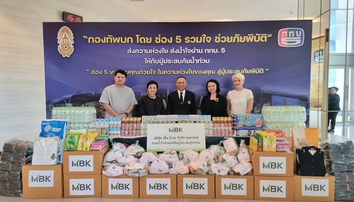 นำโดย นางสาวพุทธชาด ศรีนิศากร ประธานเจ้าหน้าที่บริหารสายการตลาด และ นางสาวศตกมล วรกุล ผู้อำนวยการอาวุโส ฝ่ายสื่อสารองค์กร บริษัท เอ็ม บี เค จำกัด (มหาชน) ได้ร่วมมอบสิ่งของที่ได้รับบริจาคทั้งหมด พร้อมกับน้ำดื่มเอ็ม บี เค ให้กับทาง กองทัพเรือ รวมถึงทาง กองทัพบก ผ่านโครงการทาง ช่อง 5 รวมใจ ช่วยภัยพิบัติ, โครงการจุฬาฯ เพื่อนพึ่ง (ภา) ช่อง 7 รวมใจฝ่าภัยพิบัติน้ำท่วมใต้ และ มูลนิธิองค์กรทำดี โดย ดร.ปนัดดา วงศ์ผู้ดี เพื่อเร่งกระจายความช่วยเหลือสู่พื้นที่ประสบอุทกภัยอย่างต่อเนื่อง