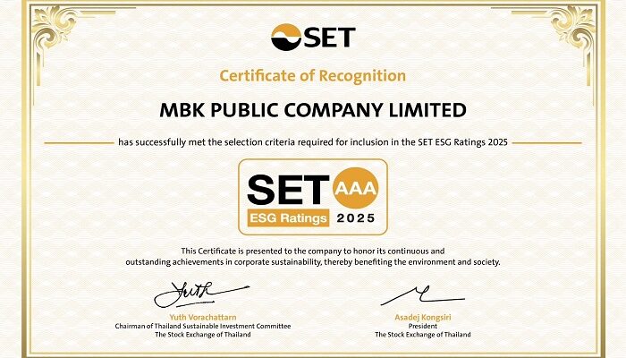 MBK คว้าคะแนนเรตติ้งหุ้นยั่งยืน SET ESG Ratings 2025 ระดับ AAA ซึ่งเป็นระดับสูงสุด โดยได้รับการคัดเลือกเป็นหุ้นยั่งยืนต่อเนื่องเป็นปีที่ 2 ติดต่อกัน