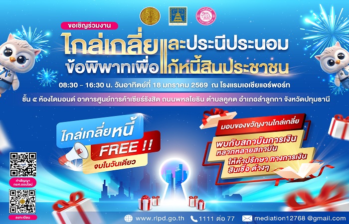 กรมคุ้มครองสิทธิและเสรีภาพ จับมือ กรมบังคับคดี มอบของขวัญปีใหม่ 2569 จัดมหกรรมไกล่เกลี่ยหนี้ฟรี จบในวันเดียว ที่เซียร์รังสิต วันที่ 18 มกราคม 2569