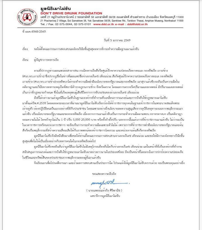 มูลนิธิเมาไม่ขับ จึงมีหนังสือมาเพื่อขอให้ท่านตั้งคณะกรรมการสอบสวน จ่าทหารเรือ และขอให้มีการลงโทษทางวินัยขั้นสูงสุดเพื่อไม่ให้เป็นเยี่ยงอย่างกับทหารคนใดในกองทัพเรือต่อไป