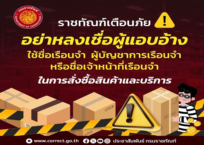 “ราชทัณฑ์” เตือนภัย! อย่าหลงเชื่อผู้แอบอ้างใช้ชื่อเรือนจำ ผู้บัญชาการเรือนจำ หรือเจ้าหน้าที่เรือนจำฯ ในการสั่งซื้อสินค้าและบริการต่าง ๆ