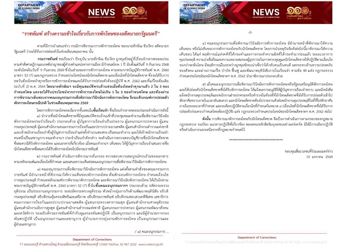 กรมราชทัณฑ์ ขอเรียนว่า ปัจจุบัน นายทักษิณ ชินวัตร ถูกคุมขังอยู่ที่เรือนจำกลางคลองเปรม ตามคำสั่งศาลฎีกาแผนกคดีอาญาของผู้ดำรงตำแหน่งทางการเมือง มีกำหนดโทษ 1 ปี นับตั้งแต่วันที่ 9 กันยายน 2568 จะพ้นโทษในวันที่ 9 กันยายน 2569 ซึ่งในส่วนของการพักการลงโทษ ตามพระราชบัญญัติราชทัณฑ์ พ.ศ. 2560 มาตรา 52 (7) และกฎกระทรวง กำหนดประโยชน์ของนักโทษเด็ดขาด และเงื่อนไขที่นักโทษเด็ดขาด ซึ่งจะได้รับการลดวันต้องโทษจำคุกหรือการพักการลงโทษและได้รับการปล่อยตัวต้องปฏิบัติ พ.ศ. 2562 และที่แก้ไขเพิ่มเติม (ฉบับที่ 2) พ.ศ. 2564 โดยนายทักษิณฯ จะมีคุณสมบัติครบถ้วนต่อเมื่อต้องโทษจำคุกมาแล้ว 2 ใน 3 ของกำหนดโทษ และจะได้รับประโยชน์จากการพักการลงโทษไม่เกิน 1 ใน 3 ของกำหนดโทษ และต้องผ่านการพิจารณาเห็นชอบจากคณะอนุกรรมการเพื่อพิจารณาวินิจฉัยการพักการลงโทษ จึงจะเข้าเกณฑ์การปล่อยตัวพักการลงโทษกรณีปกติ ในช่วงเดือนพฤษภาคม 2569