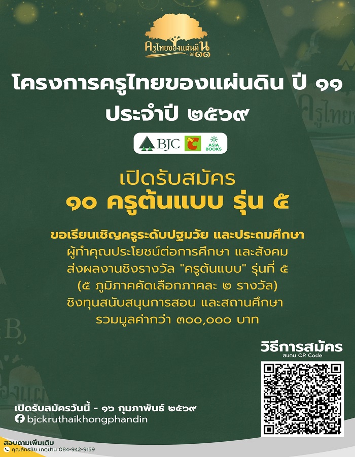 • ประกาศผลรอบ 30 ท่านสุดท้าย: ต้นเดือนมีนาคม 2569 ผ่านทาง Facebook Page: บีเจซีครูไทยของแผ่นดิน