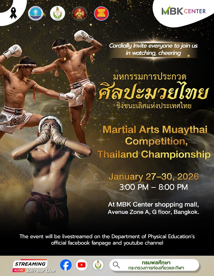 ศูนย์การค้าเอ็ม บี เค เซ็นเตอร์ ร่วมกับ กรมพลศึกษา ชวนชมชวนเชียร์ “มหกรรมการประกวดศิลปะมวยไทย ชิงชนะเลิศแห่งประเทศไทย” (Martial Arts Muaythai Competition, Thailand Championship) ระหว่างวันอังคารที่ 27 – วันศุกร์ที่ 30 มกราคม 2569 ตั้งแต่เวลา 15.00 น. – 20.00 น. ณ ชั้น G ลานกิจกรรมเอ็ม บี เค อเวนิว โซน A