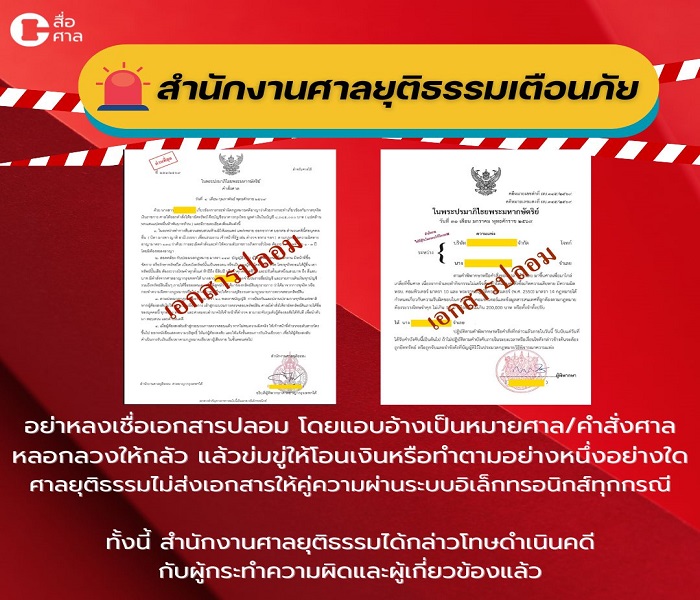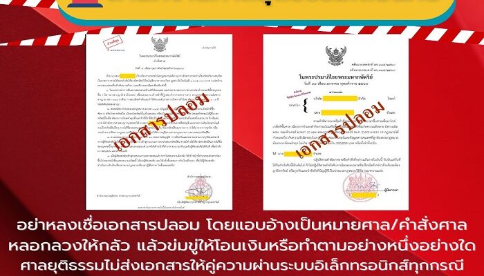 โดยวิธีการหลอกลวงของมิจฉาชีพขณะนี้ จะส่งเอกสารปลอมที่มีการระบุข้อความเป็นหมายศาลทำให้ท่านตกใจหรือกลัว แล้วหลอกให้ท่านโอนเงินหรือทำตามอย่างหนึ่งอย่างใด โดย สำนักงานศาลยุติธรรม จะได้ดำเนินการกล่าวโทษดำเนินคดีกับผู้กระทำความผิดและผู้เกี่ยวข้องต่อไป