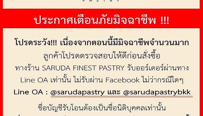 ทาง SARUDA FINEST PASTRY ขอชี้แจงว่า ร้านไม่มีส่วนเกี่ยวข้องใด ๆ กับ Facebook Page ปลอมดังกล่าว และขอความร่วมมือลูกค้าทุกท่านหลีกเลี่ยงการติดต่อ การทำธุรกรรม หรือการคลิกลิงก์โฆษณาใด ๆ ที่เผยแพร่ผ่านเพจปลอมดังกล่าวโดยเด็ดขาด