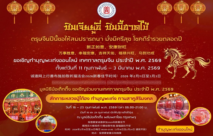ผู้สื่อข่าวรายงานว่า ระหว่างวันที่ 16 – 25 ก.พ.69 มูลนิธิป่อเต็กตึ๊ง โดย นายวิเชียร เตชะไพบูลย์ ประธานกรรมการ ขอเชิญศิษยานุศิษย์ และสาธุชนทุกท่าน ร่วม “สักการะหลวงปู่ไต้ฮง” ขอพรเนื่องในเทศกาลตรุษจีน ลงชื่อ สวดชัยมงคลคาถา หรือ “พะเก่ง” เพื่อความเป็นสิริมงคลตลอดปี เป็นพิธีมหามงคลใหญ่ 1 ปีมีเพียงครั้งเดียว ที่เปิดให้ทุกท่านได้เลือกทำบุญพะเก่ง ๆ ละ 20 บาทตามแต่ประสงค์ ประกอบด้วย ขอให้ครอบครัวมีสุข (แกหมึ่งเก่ง) , สะเดาะเคราะห์ (ปออุ่งเก่ง) , เสริมโชคลาภ (คิ่วไฉ่เก่ง) , เสริมดวงชะตา (ส่วยกุงเก่ง) , เสริมความมั่นคงสถาพร (กึงกีเก่ง) รวมถึงทำบุญสะเดาะเคราะห์และเสริมความเป็นสิริมงคลกับรูปปั้นนักษัตรปีมะเมีย รับประทาน “สาคูสิริมงคล” เพื่อความกลมเกลียวและอยู่เย็นเป็นสุข อัญเชิญ “ฮู้แดง” (ยันต์) ของหลวงปู่ไต้ฮง เพื่อนำไปประทับหน้าบ้าน เคหะสถาน หรือพกติดตัวเพื่อคุ้มครอง “เคาะระฆังทอง” ให้ก้องกังวานเพื่อให้ชีวิตสดใส การงานรุ่งเรืองระบือไกล และ ร่วม “พิธีเวียนธูปศักดิ์สิทธิ์” เพื่อขอพรเทพยดาฟ้าดินเนื่องในวันประสูติ (ทีกงแซ) ซึ่งในปีนี้ตรงกับวันอังคารที่ 24 กุมภาพันธ์ 2569 ขออำนาจฟ้าดินเป็นที่พึ่ง ขอให้สิ่งศักดิ์สิทธิ์ที่ตนนับถือ เช่น หลวงปู่ไต้ฮง ช่วยดลบันดาลให้ประสบโชคดีตลอดปีใหม่ (โดยในวันที่ 16 และ 24 กุมภาพันธ์ 2569 มูลนิธิป่อเต็กตึ๊ง เปิดบริการโต้รุ่ง)