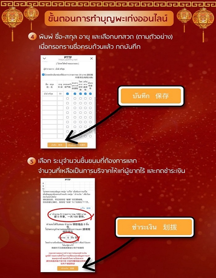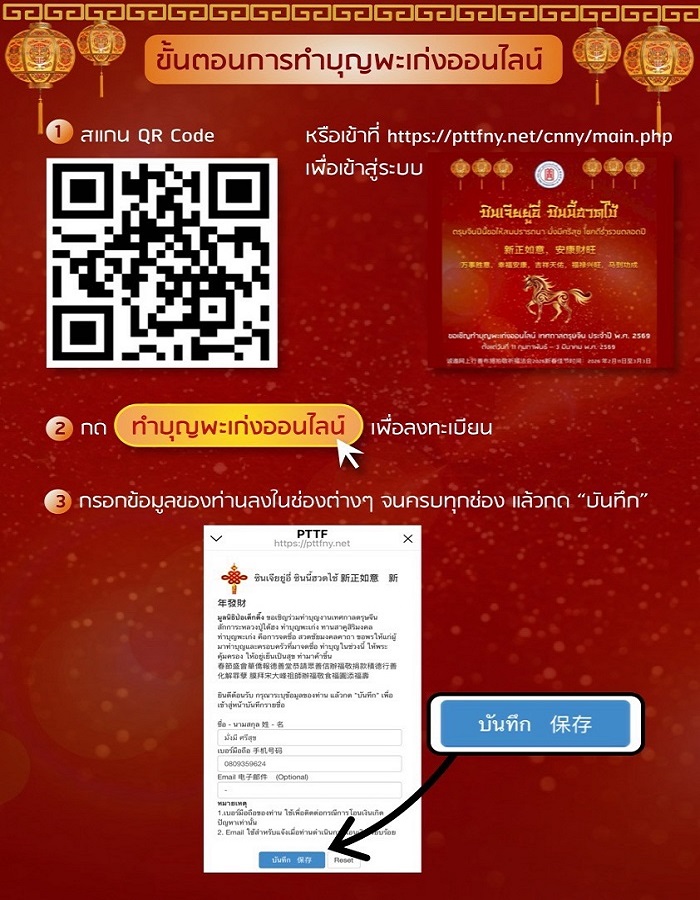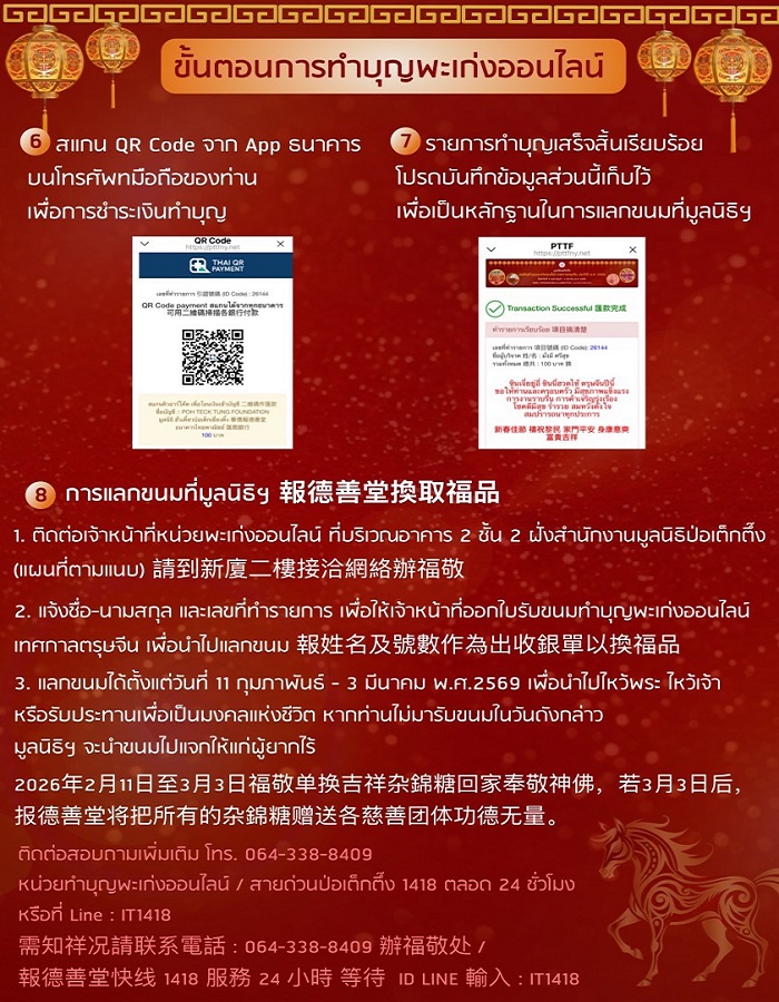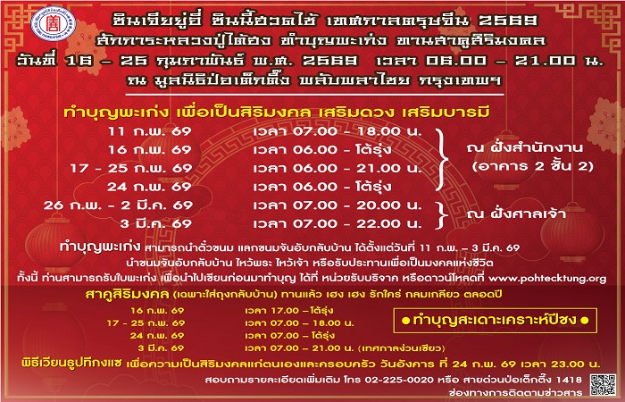 พิธีสวดชัยมงคลคาถา [พะเก่ง] มูลนิธิป่อเต็กตึ๊ง เริ่มเปิดให้สาธุชน ลงชื่อสวดชัยมงคลคาถา ตั้งแต่วันที่ 11 กุมภาพันธ์ พ.ศ. 2569 ทั้ง 2 ช่องทาง ได้แก่ 1. ที่มูลนิธิป่อเต็กตึ๊ง พลับพลาไชย และ 2. พะเก่งออนไลน์ (ผ่านทางเว็บไซต์ www.pttfny.net/cnny) โดยท่านสามารถติดตามรายละเอียด รวมถึงรับชมพิธีรวมถึงไลฟ์พิธีสำคัญต่าง ๆ ตลอดช่วงเทศกาลได้ที่เฟซบุ๊ก แฟนเพจมูลนิธิป่อเต็กตึ๊ง www.facebook.com/atpohtecktung ติดต่อสอบถามข้อมูลเพิ่มเติมได้ที่ สายด่วนป่อเต็กตึ๊ง 1418
