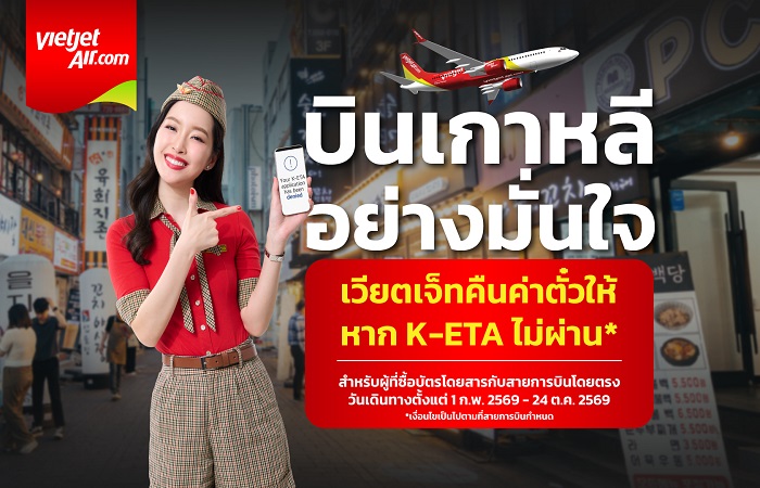 เวียตเจ็ทไทยแลนด์ เปิดตัวบริการใหม่ “K-ETA Refund & Credit Shell” เพื่ออำนวยความสะดวกและเพิ่มความมั่นใจให้กับผู้โดยสารที่เดินทางสู่ประเทศเกาหลีใต้ โดยผู้โดยสารสามารถเลือกขอรับเงินคืน หรือเก็บมูลค่าบัตรโดยสารในรูปแบบ Credit Shell ได้ ในกรณีที่การยื่นขอ Korea Electronic Travel Authorization (K-ETA) ไม่ได้รับการอนุมัติ ทั้งนี้ บริการดังกล่าวช่วยให้ผู้โดยสารวางแผนการเดินทางได้อย่างมั่นใจยิ่งขึ้น พร้อมเพิ่มความยืดหยุ่นและความอุ่นใจตลอดการเดินทาง