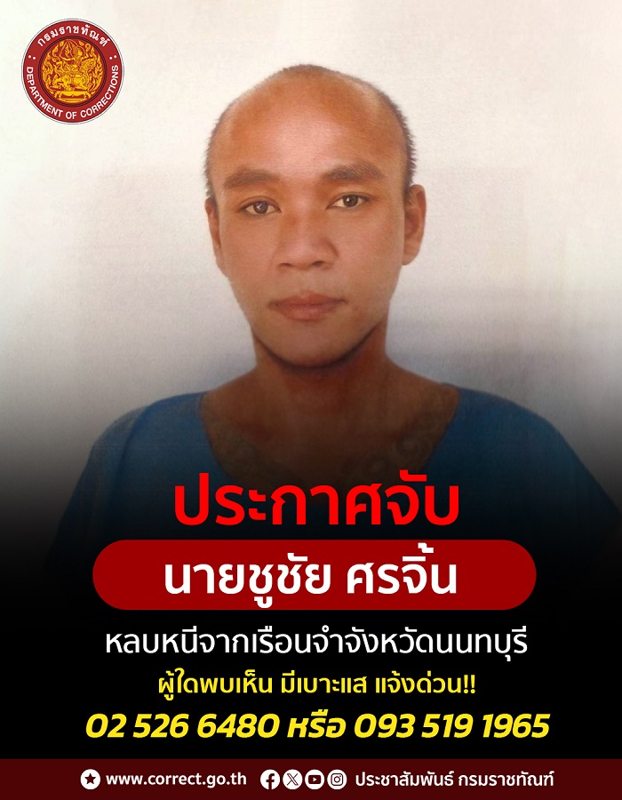 กรมราชทัณฑ์ ขอรายงานว่า เมื่อวันที่ 13 กุมภาพันธ์ 2569 เวลาประมาณ 02.00 น. นายชูชัย ศรจิ้น อายุ 40 ปี ฐานความผิดร่วมกันลักทรัพย์ในเวลากลางคืนโดยใช้ยานพาหนะเพื่อสะดวกแก่การกระทำความผิดหรือการพาทรัพย์นั้นไปหรือเพื่อให้พ้นจากการจับกุม ก่อเหตุหลบหนีออกจากเรือนจำจังหวัดนนทบุรี