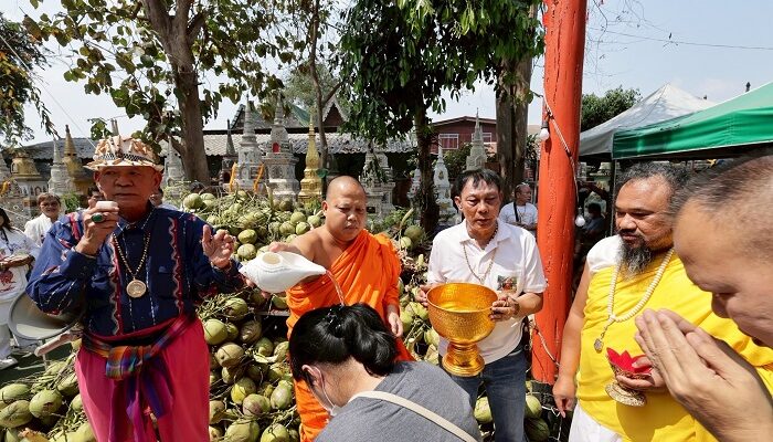 วัดท่าผาแทบแตก! พระมหารุ่งธรรม เจ้าอาวาสวัดท่าผา รดน้ำพุทธมนต์ด้วยมหาสังข์ให้กับทุก ๆ ท่านที่อยู่ในพิธี ยิ่งใหญ่เหนือคำบรรยาย ประชาชนทั้งในประเทศและต่างประเทศได้ร่วมกันเป็นเจ้าภาพถวายมะพร้าวน้ำหอมปลอดสารพิษ จำนวน 2,000 ลูก เพื่อเป็นงานมหาบุญ มหากุศล มหาทาน เมื่อวันที่ 15 ก.พ.69