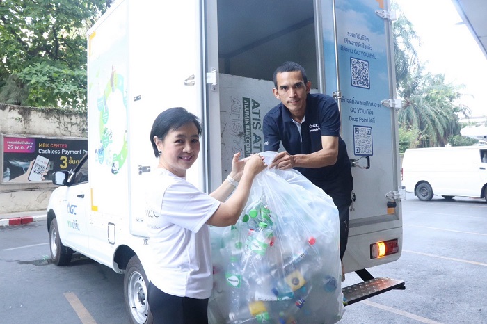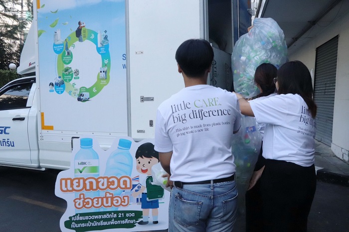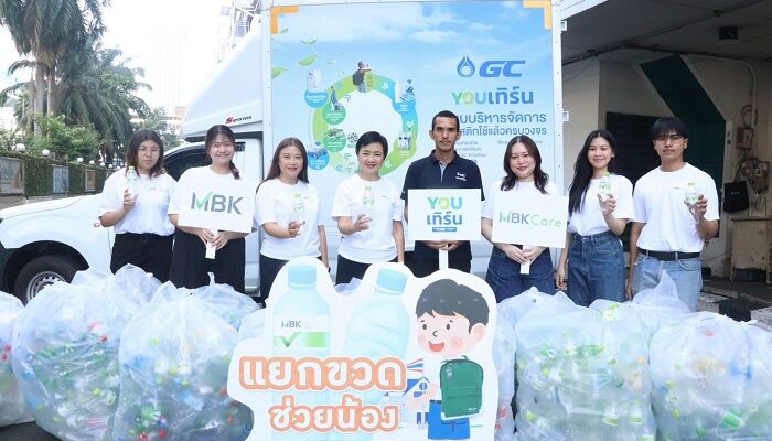 นางสาวศตกมล วรกุล ผู้อำนวยการอาวุโสฝ่ายสื่อสารองค์กร บริษัท อินเทลลิเจ้นท์ ครีเอทีฟ แอนด์ มาร์เก็ตติ้ง จำกัด (ที่ 4 จากซ้าย) ผู้บริหารธุรกิจของบริษัท เอ็ม บี เค จำกัด (มหาชน) พร้อมด้วย ตัวแทนพนักงานจิตอาสา MBK Spirit ร่วมส่งมอบขวด PET ให้แก่ GC YOU เทิร์น ของบริษัท พีทีที โกลบอล เคมิคอล จำกัด (มหาชน) เพื่อเดินหน้าสานต่อในการนำขวดพลาสติกไปรีไซเคิลทำกระเป๋าในกิจกรรม “แยกขวดช่วยน้อง” ภายใต้โครงการ ข.ขวดรักษ์โลก เปลี่ยนขวดพลาสติกใสเป็นกระเป๋านักเรียนเพื่อการศึกษา ณ ศูนย์การค้าเอ็ม บี เค เซ็นเตอร์ เมื่อวันก่อน