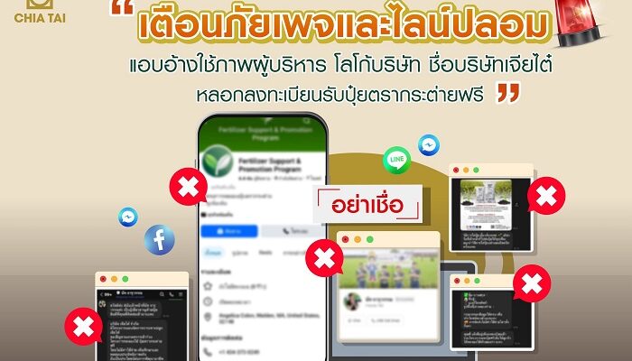 บริษัท เจียไต๋ จำกัด ผู้นำธุรกิจนวัตกรรมการเกษตรของไทย ขอแจ้งเตือนประชาชนและเกษตรกร หลังตรวจพบมิจฉาชีพจัดทำเพจเฟซบุ๊กปลอม แอบอ้างชื่อโครงการ ซึ่งอาจทำให้เข้าใจผิดว่าเป็น “โครงการแผนจัดการการเพาะปลูกเจียไต๋” พร้อมใช้ตราสัญลักษณ์ของบริษัทฯ และผลิตภัณฑ์ “ปุ๋ยตรากระต่าย” รวมถึงจัดทำบัญชี LINE@ โดยนำภาพผู้บริหารไปใช้โดยไม่ได้รับอนุญาต เพื่อหลอกลวงให้เกษตรกรแอดไลน์และลงทะเบียนรับสิทธิ “ปุ๋ยตรากระต่ายฟรี”