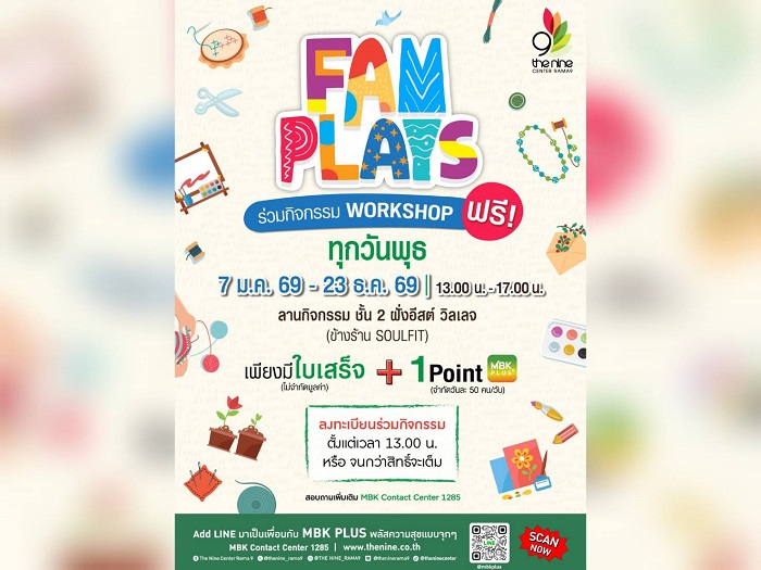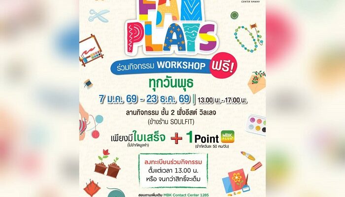 สำหรับผู้ที่สนใจเข้าร่วมเวิร์กชอป FAM PLAYS 2026 เพียงมีใบเสร็จ (ไม่จำกัดมูลค่า) + 1 Point MBK PLUS (จำกัด 2 สิทธิ์/คน/จำกัด 50 สิทธิ์/วัน) สามารถลงทะเบียนร่วมเวิร์กชอปได้ บริเวณลานกิจกรรม Workshop ชั้น 2 ฝั่งอีสต์วิลเลจ (ข้างร้าน Soofu) ทุกวันพุธของเดือน ในเวลา 13.00 น. – 17.00 น.