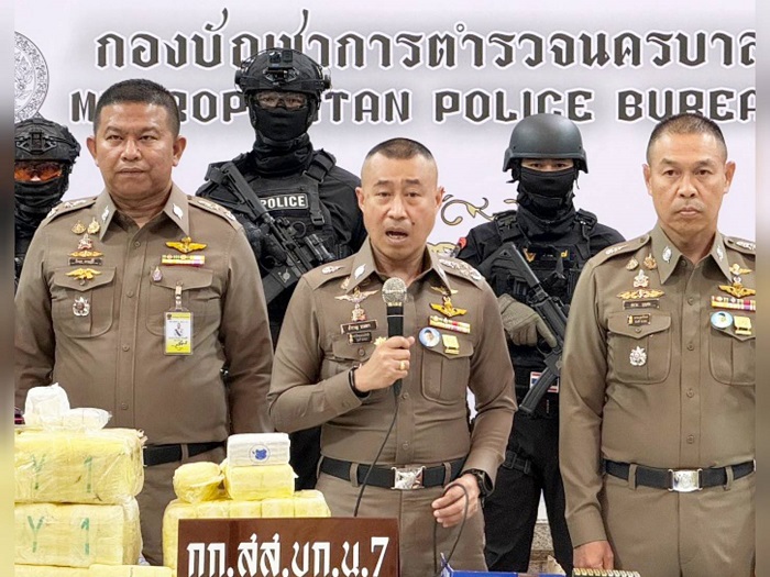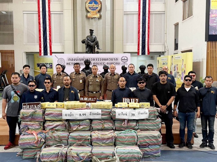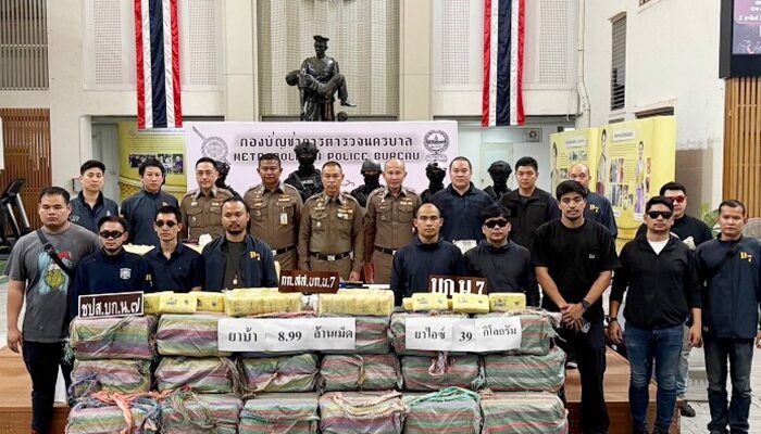 วันนี้ (9 มี.ค.69) ที่กองบัญชาการตำรวจนครบาล (บช.น.) พล.ต.อ.สำราญ นวลมา รอง ผบ.ตร. พร้อมด้วย พล.ต.ท.สยาม บุญสม ผบช.น. พล.ต.ต.ธีรเดช ธรรมสุธีร์ รอง ผบช.น. พล.ต.ต.ชัยยะ เพ็ชรปัญญา ผบก.น.7 และ พ.ต.อ.อัษฎาวุธ ขวัญเมือง ผกก.สส.บก.น.7 แถลงผลงานชิ้นโบแดง หลังนำกำลังชุดสืบสวน บก.น.7 เข้าขยี้เครือข่ายค้ายารายใหญ่ จับกุม 3 ผู้ต้องหาหลัก ได้แก่ น.ส.รัฐกรานต์ อายุ 44 ปี, นายสุโรจน์ อายุ 48 ปี และ นายอัคพล อายุ 44 ปี พร้อมของกลางที่เห็นแล้วต้องตะลึง ยาบ้า 8.99 ล้านเม็ด ยาไอซ์ 39 กก. อาวุธปืนปืนพกสั้น 3 กระบอก พร้อมกระสุน (เตรียมพร้อมสู้) ยานพาหนะ รถยนต์ 3 คัน (ใช้ลำเลียงและนำทาง)