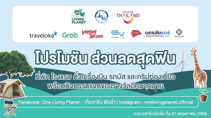 นอกจากนี้ยังได้รับความร่วมมือจากพันธมิตรชั้นนำในการนำเสนอสิทธิประโยชน์และโปรโมชันพิเศษ ครอบคลุมทั้งการเดินทาง ที่พักและไลฟ์สไตล์ อาทิ Traveloka มอบส่วนลดสูงสุด 200 บาทสำหรับที่พักในโครงการ, Grab มอบส่วนลด 15% สูงสุด 100 บาท สำหรับบริการเดินทางใน 8 จังหวัดนำร่อง, Vietjet Thailand มอบส่วนลด 30% สำหรับเส้นทางท่องเที่ยวภายในประเทศ, ลูกค้าบัตรเครดิต KTC ทุกประเภท รับเครดิตเงินคืนสูงสุด 13% เมื่อจองตรงกับโรงแรมที่ร่วมรายการในโครงการ, นครชัยแอร์มอบส่วนลดค่าโดยสาร 10 บาท พร้อมสิทธิ์ลุ้นรับของรางวัล, Oasis Spa มอบทรีตเม้นต์ดูแลผิวสูตรธรรมชาติมูลค่า 1,766 บาท ฟรีสำหรับลูกค้าที่เลือกใช้บริการโปรแกรมนวดสปาสูตรซิกเนเจอร์เพื่อความผ่อนคลายเหนือระดับ และแคมเปญออนไลน์จาก EV Station PluZ สถานีชาร์จ EV Station PluZ มอบคูปองส่วนลด 50 บาท! เมื่อลงทะเบียนเข้าร่วมโครงการ One Living Planet และมียอดชาร์จสะสม เม.ย. – พ.ค. 69 ไม่ต่ำกว่า 500 บาท