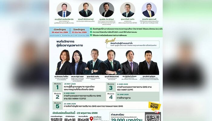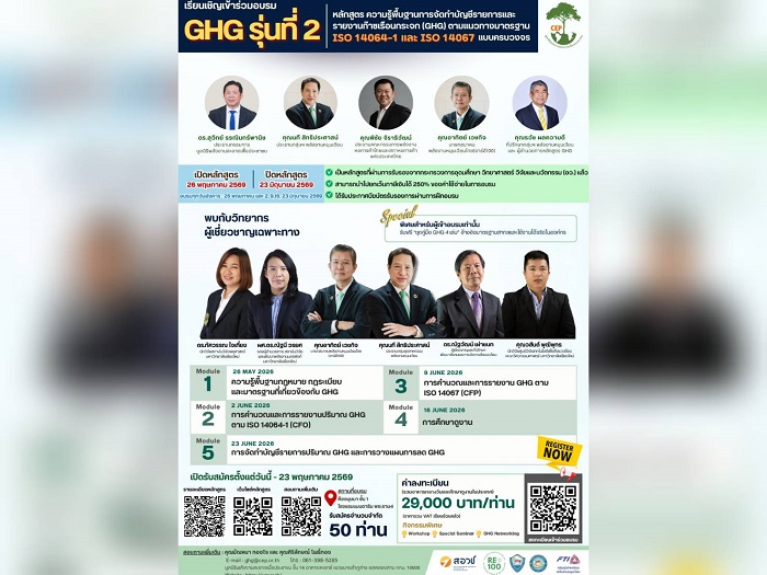 ทั้งนี้ กรุณาชำระเงิน ภายในวันที่ 20 พฤษภาคม 2569 ค่าลงทะเบียนดังกล่าวรวม อาหารว่าง เครื่องดื่ม อาหารกลางวัน ตลอดหลักสูตร พร้อมกิจกรรม Networking Session และ GHG Field Trip