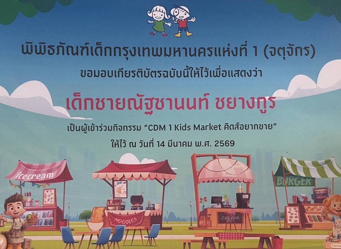เมื่อเร็ว ๆ นี้ พิพิธภัณฑ์เด็กกรุงเทพมหานครแห่งที่ 1 (จตุจักร) ได้มอบเกียรติบัตรให้แก่ เด็กชาย ณัชชานนท์ ชยางกูร (น้องเอเบิ้ล) ผู้เข้าร่วมกิจกรรม “CDM 1 Kids Maker คิดส์อยากขยาย” เพื่อส่งเสริมการเรียนรู้และพัฒนาศักยภาพของเด็กและเยาวชน