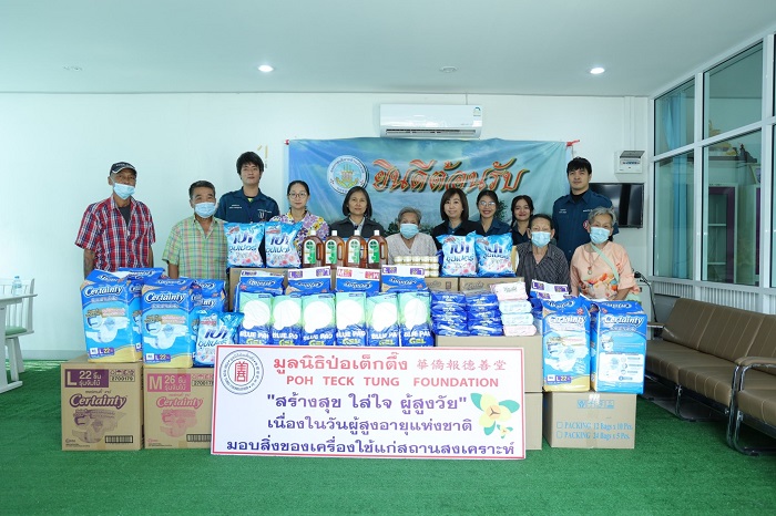 พร้อมกันนี้ มูลนิธิป่อเต็กตึ๊ง ได้จัดโครงการ “ป่อเต็กตึ๊ง สร้างสุข ใส่ใจ ผู้สูงวัย” ลงพื้นที่มอบสิ่งของเครื่องใช้จำเป็น อาทิ ผ้าอ้อมสำเร็จรูป น้ำยาฆ่าเชื้อโรค แผ่นรองซับ ผงซักฟอก ทิชชูเปียก ปิโตรเลียมเจลลี่ (สำหรับผู้ป่วยติดเตียง) ให้แก่ผู้สูงวัย ณ ศูนย์พัฒนาการจัดสวัสดิการสังคมผู้สูงอายุปทุมธานี สถานคุ้มครองคนไร้ที่พึ่งชายธัญบุรี และ สถานคุ้มครองคนไร้ที่พึ่งหญิงธัญบุรี จ.ปทุมธานี สถานสงเคราะห์หญิงชราไร้ที่พึ่ง บ้านสุทธาวาส เฉลิมพระเกียรติฯ จ.นครนายก ศูนย์สงเคราะห์ผู้สูงอายุ คามิลเลียน จ.ปราจีนบุรี สถานสงเคราะห์คนชราเฉลิมราชกุมารี (หลวงพ่อลำใยอุปถัมภ์) จ.กาญจนบุรี สถานสงเคราะห์คนชรานครปฐม และ สถานสงเคราะห์คนชราเฉลิมราชกุมารี (หลวงพ่อเปิ่นอุปถัมภ์) จ.นครปฐม สถานสงเคราะห์คนชราบ้านเขาบ่อแก้ว จ.นครสวรรค์ และ ศูนย์พัฒนาการจัดสวัสดิการสังคมผู้สูงอายุวาสนะเวศม์ จ.พระนครศรีอยุธยา รวม 10 แห่ง คิดเป็นมูลค่าทั้งสิ้น 634,580 บาท (หกแสนสามหมื่นสี่พันห้าร้อยแปดสิบบาทถ้วน) เพื่อเป็นขวัญและกำลังใจแก่ผู้สูงวัย เนื่องในวันผู้สูงอายุแห่งชาติ ประจำปี 2569