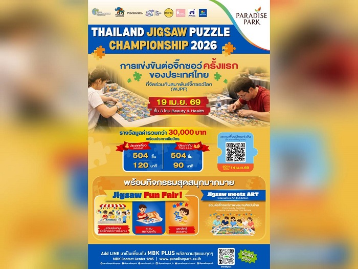พาราไดซ์ พาร์ค ศูนย์การค้าในเครือเอ็ม บี เค ร่วมกับ สมาพันธ์จิ๊กซอว์โลก (WJPF) เตรียมสร้างปรากฏการณ์ใหม่ให้กับวงการเกมเสริมทักษะงาน “Thailand Jigsaw Puzzle Championship 2026” การแข่งขันต่อจิ๊กซอว์ครั้งแรกของประเทศไทย ชิงเงินรางวัลรวมมูลค่ากว่า 30,000 บาท พร้อมประกาศนียบัตร