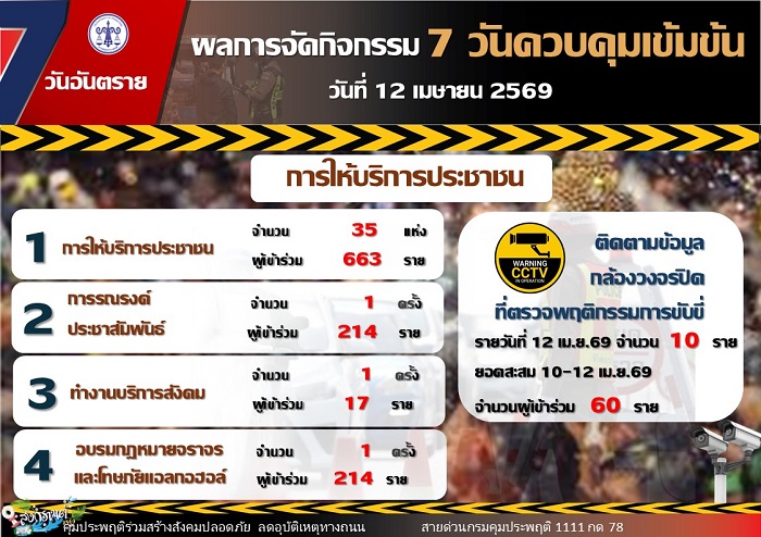 ร.ต.อ.ปิยะ รักสกุล อธิบดีกรมคุมประพฤติ เปิดเผยสถิติคดีที่ศาลสั่งคุมความประพฤติในวันที่ 12 เมษายน 2569 ว่า เนื่องจากศาลปิดทำการในหลายพื้นที่ จึงมีคดีเข้าสู่กระบวนการคุมความประพฤติรวมทั้งสิ้น เพียง 140 คดี แบ่งเป็น คดีขับรถในขณะเมาสุรา 133 คดี คิดเป็นร้อยละ 95 และคดีขับเสพ 7 คดี คิดเป็นร้อยละ 5 โดยมีสถิติคดีสะสมช่วง 3 วัน (10 – 12 เมษายน 2569) รวมทั้งสิ้น 1,750 คดี แบ่งเป็น คดีขับรถขณะเมาสุรา 1,613 คดี คิดเป็นร้อยละ 92.2 คดีขับเสพ 134 คดี คิดเป็นร้อยละ 7.6 และคดีขับรถประมาท 3 คดี คิดเป็นร้อยละ 0.2