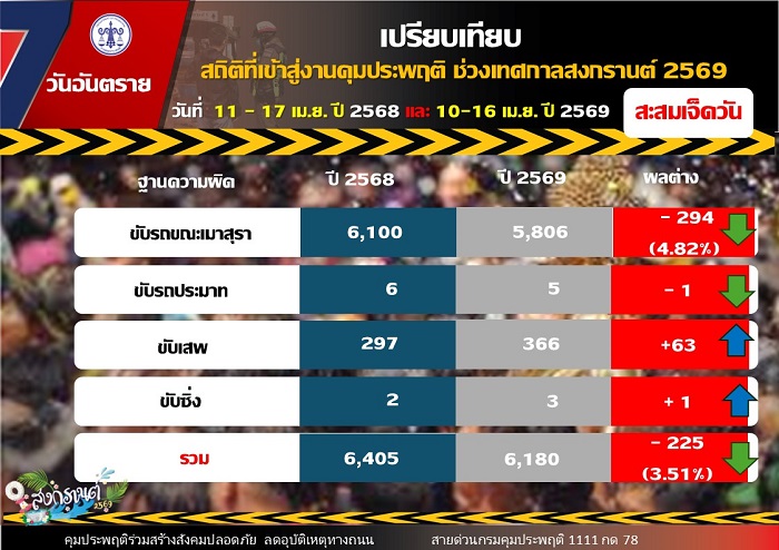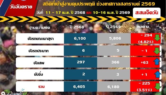 เมื่อเปรียบเทียบกับช่วงเทศกาลสงกรานต์ ปี 2568 ซึ่งมีคดีขับรถขณะเมาสุรา จำนวน 6,100 คดี พบว่าในปี 2569 มีจำนวน 5,806 คดี ลดลงจากปีก่อน จำนวน 294 คดี คิดเป็นร้อยละ 4.82