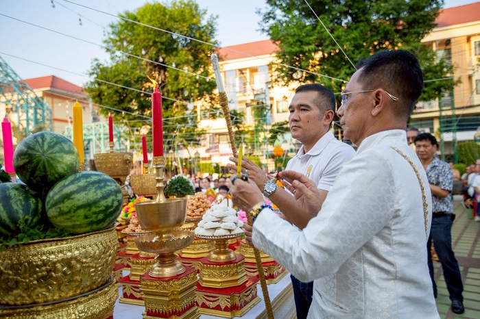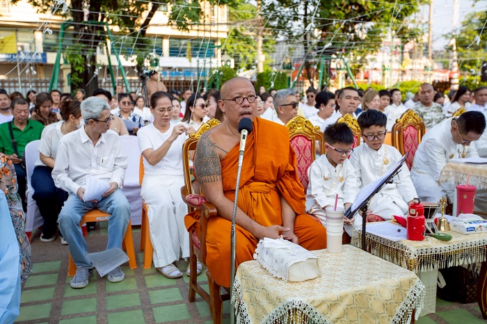 จากนั้น พิธีได้เริ่มด้วยการบวงสรวงองค์เทพยาดาอารัก ซึ่งเป็นพิธีทางพราหมณ์ เพื่อเป็นการแสดงความเคารพต่อสิ่งศักดิ์สิทธิ์ จากนั้น หลวงพี่น้ำฝน ได้นำกล่าวคำปฏิญาณ เพื่อขอขมากรรม อันเป็นการกระทำที่เคยผิดพลั้งพลาดด้วยความตั้งใจก็ดี ไม่ตั้งใจก็ดี และสงบจิตใจเพื่อชำระล้างจิตใจ เพื่อพร้อมสำหรับการเริ่มต้นการดำเนินชีวิตครั้งใหม่ ด้วยการมีสัจจะไว้เป็นที่ตั้ง จากนั้น คณะสงฆ์ ได้ทำพิธีสวดเจริญพระพุทธมนต์ เพื่อเป็นสิริมงคลเป็นอันเสร็จสิ้นพิธี