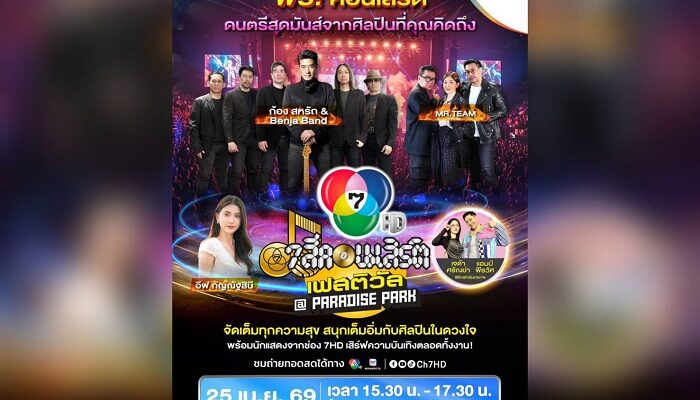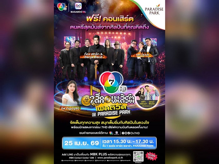 ซัมเมอร์นี้เตรียมตัวให้พร้อม แล้วออกมาสนุกกันต่อกับ ฟรี! คอนเสิร์ตสุดฟีลกู๊ดที่หลายคนรอคอย พาราไดซ์ พาร์ค ศูนย์การค้าในเครือเอ็ม บี เค ร่วมกับ ช่อง 7HD ชวนทุกคนย้อนความสุขวันวาน จัดเต็มความบันเทิงในงาน 7 สีคอนเสิร์ต เฟสติวัล @ Paradise Park ที่ขนทัพศิลปินคุณภาพมามอบความสุขแบบใกล้ชิด และในครั้งนี้พบกับศิลปินระดับคุณภาพ “ก้อง สหรัถ & Benja Band” นักร้องเสียงอบอุ่นที่เต็มไปด้วยเสน่ห์เฉพาะตัว เพิ่มดีกรีความมันส์กับวงดนตรีป๊อปร็อกระดับตำนาน “MR.TEAM” ที่เตรียมเพลงฮิตมาให้แฟน ๆ ได้ร้องตามกันแบบจัดเต็ม เสริมทัพด้วยแขกรับเชิญ “อีฟ กัญณัฐสินี” นักแสดงจากช่อง 7HD ที่จะมาร่วมสร้างสีสันและความสนุกตลอดทั้งงาน พร้อมด้วย 2 พิธีกรมากความสามารถ “เจด้า ศรัณย่า” และ “แอมป์ พีรวัศ”