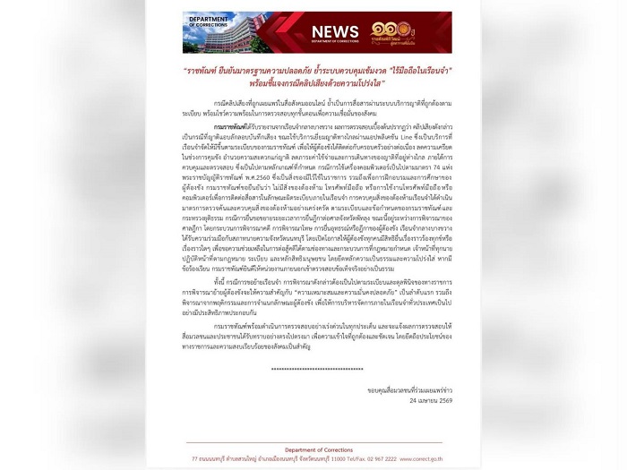 ราชทัณฑ์ ยืนยันมาตรฐานความปลอดภัย ย้ำระบบควบคุมเข้มงวด “ไร้มือถือในเรือนจำ” พร้อมชี้แจงกรณีคลิปเสียงด้วยความโปร่งใส