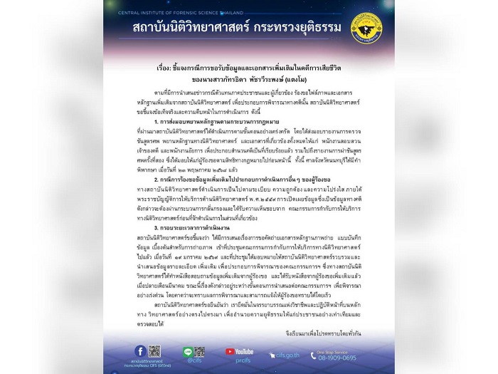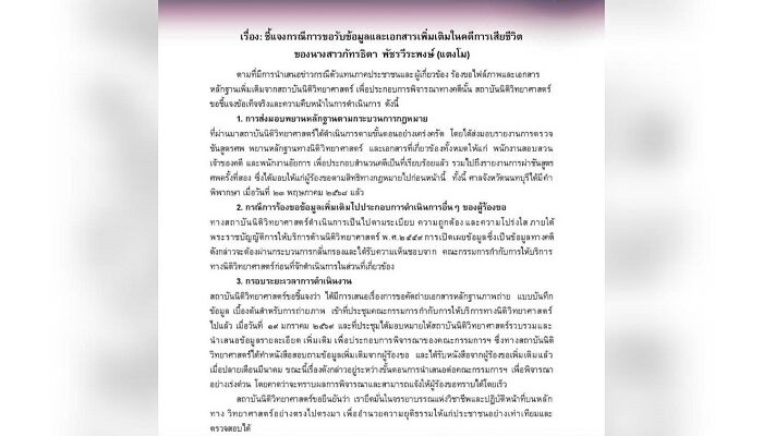 สถาบันนิติวิทยาศาสตร์ ชี้แจงกรณีการขอรับข้อมูลและเอกสารเพิ่มเติมในคดีการเสียชีวิตของนางสาวภัทรธิดา พัชรวีระพงษ์ (แตงโม)