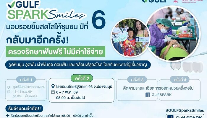 GULF จับมือ คณะทันตแพทย์จุฬาฯ เดินหน้า “GULF Sparks Smiles” ปี 6 เคลื่อนหน่วยทันตกรรมฟรีสู่ภูมิภาค ชวนชุมชน อ.กบินทร์บุรี จ.ปราจีนบุรี มาสร้างรอยยิ้มสดใส วันที่ 6-7 พ.ค. 69